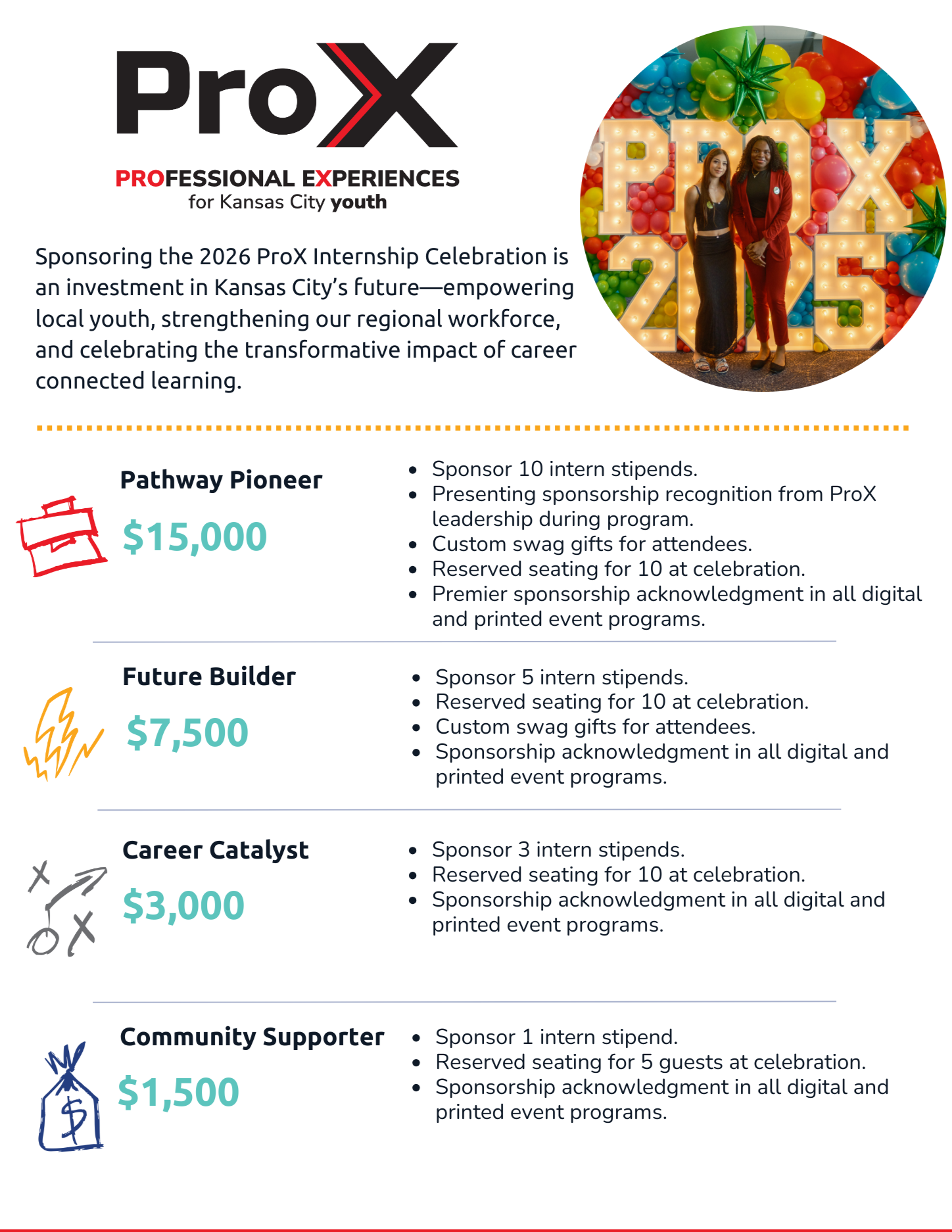 At ProX, we connect Kansas City high school students with meaningful internships, empowering the next generation to explore career paths, develop professional skills, and contribute to the regional workforce. Your sponsorship helps us bridge the gap between education and employment, creating equitable opportunities for students from all backgrounds.